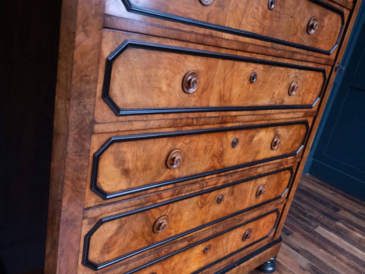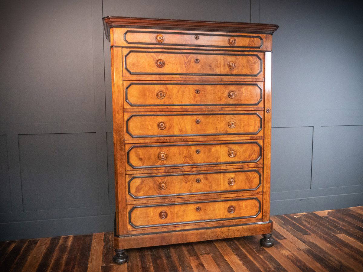 19th Century French, Walnut, and ebonised seven drawer chest with side locking bar and key. Exquisite detail with original turned handles and escutcheons. Dimensions: Width – 127cm Depth – 57cm Height – 169cm