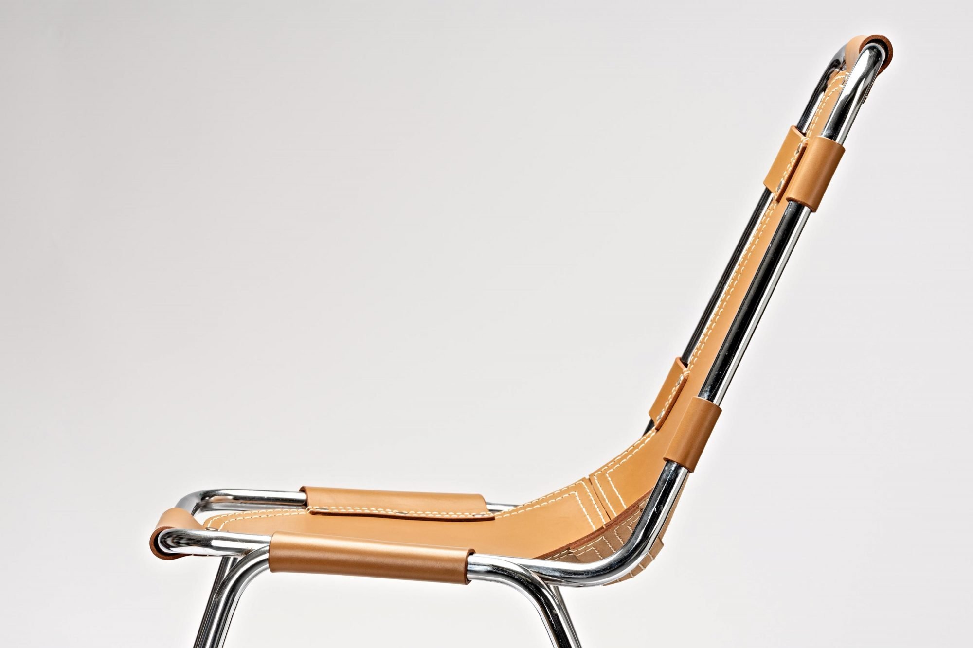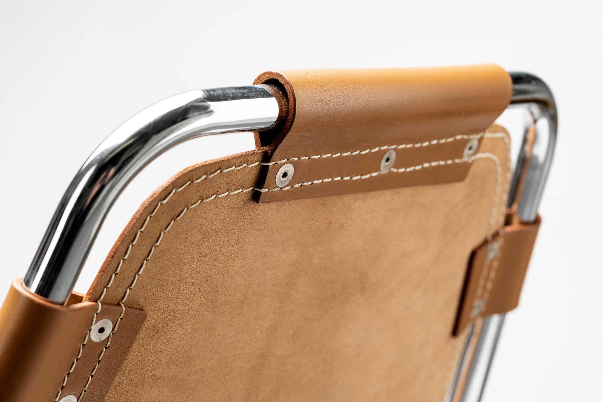 Refurbished chrome tubular frame with handmade replacement, hand-stitched wax thread stitched English saddle leather sling upholstery with riveted loop detail.